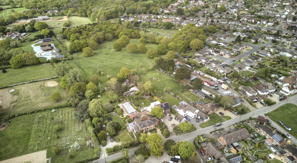 The site measures approximately 6.05 acres (2.45 hectares) and currently comprises an existing bungalow with paddock land to the rear. The land is bordered by residential properties to the south and west, and grass and woodland to the north and east.